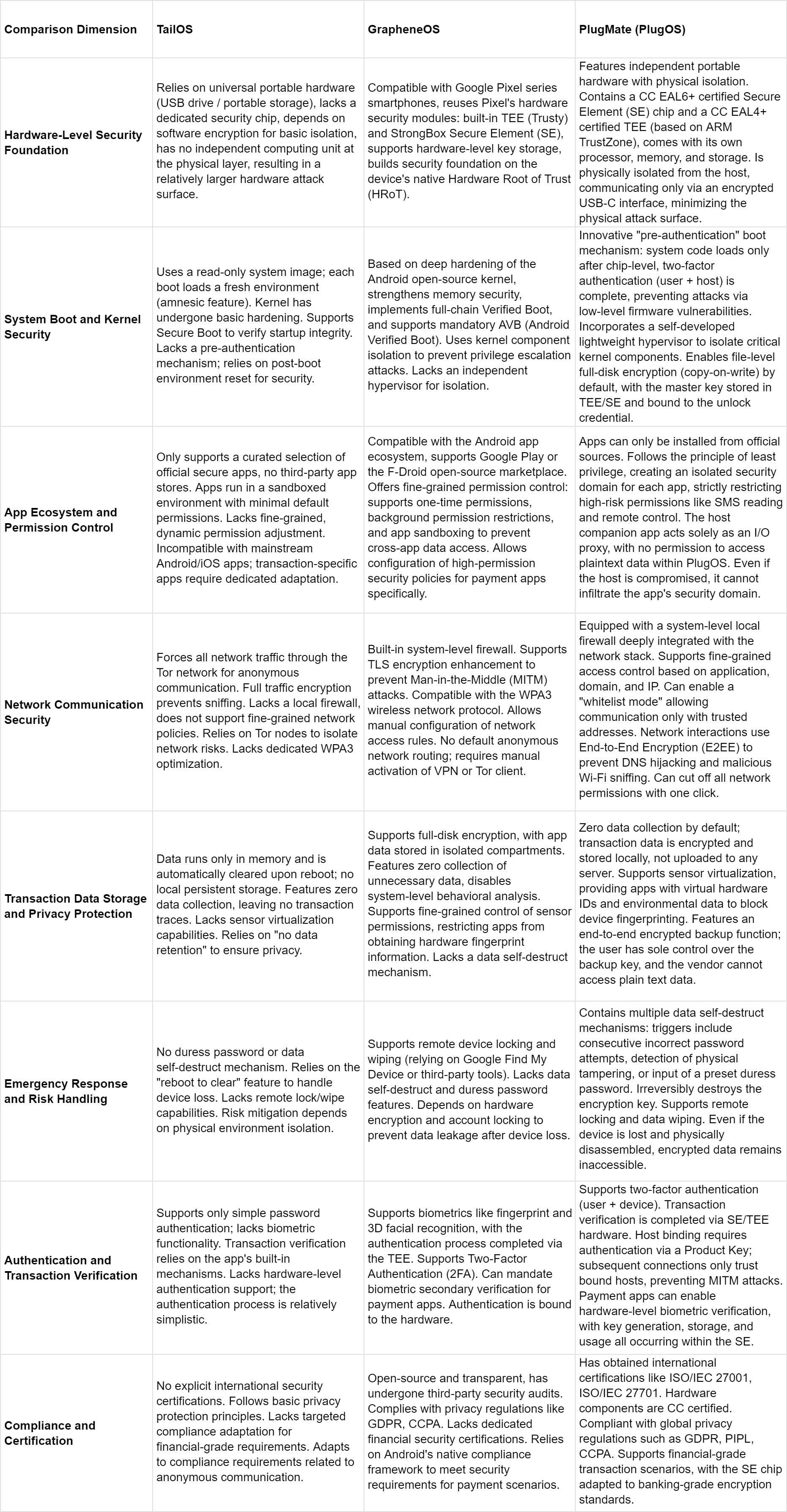 ● TailOS: Built on universal portable hardware like USB drives, with no dedicated security chip. Relies on software encryption for basic isolation and lacks a separate physical computing unit, making it the most vulnerable to hardware attacks.